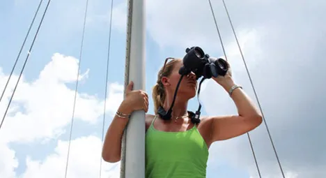 The Swarovski binocular uses a roof prism, which makes for a long, narrow, and sleek design. Swarovski claims its patented multi-coated glass optimizes light gathering, color fidelity, and sharpness even in low-light conditions. We agree. The Swarovski glasses provided a crisp, clear view under all test conditions. The exterior is coated with a tough, green plastic armor. They are not equipped with a compass. All the male testers found the Swarovski a bit narrow and small in hand. Extended fingers would overlap uncomfortably in the center. Our female tester fit this binocular well, giving it a thumbs up for grip and feel. At 40.6 ounces, the Swarovski is comparable to both the West Marine and Steiner binos in weight.