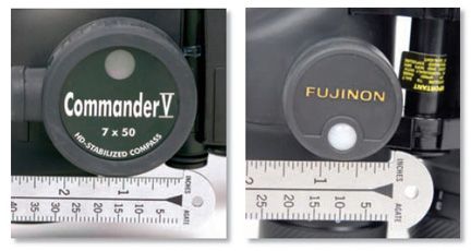 Compared to the bulky Fujinon binocular, the Steiner Commander V looks small and compact. According to Steiner, it features high-definition optics, and a new formulation of the blue, plastic armor coating should increase longevity. A rather large wet compass sits on top of the right-hand lens tube. Most of our testers said the compass interfered with their grip of this binocular. Weighing in at a svelte 40 ounces, the Commander is nearly a pound lighter than the Fujinon.
