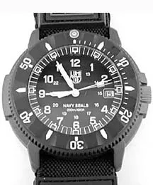 Luminox Original Navy SEAL Dive Watch Series II. One of many styling and case variations on the same basic watch movement, this model is the answer to readability at night. All three hands and all 12 hour markers are self-powered, so they glow on their own, via a Swiss technology called traser. Each of the markers is a sealed, hollow body of mineral glass whose interior wall is coated with a luminescent material similar to that used on the screen of a television picture tube. The internal volume is filled with tritium gas. Tritium emits electrons, which travel to the luminescent material and cause it to emit light, a process similar to light production in a CRT.