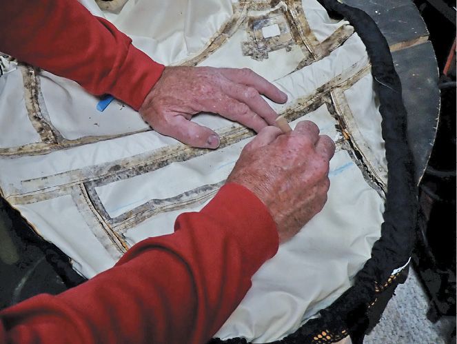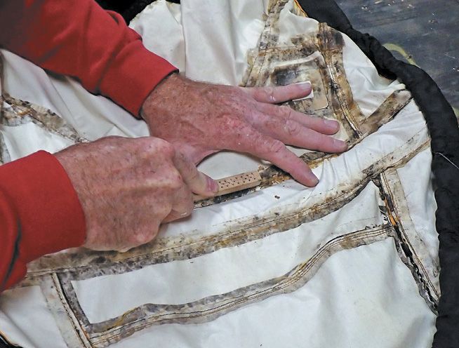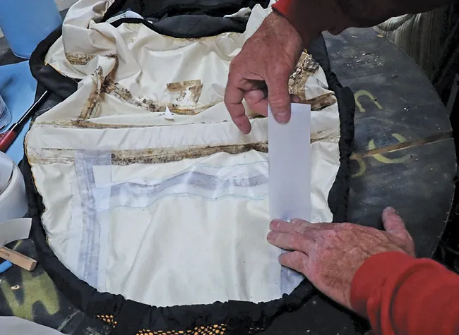 In previous testing 3M Primer 94 noticeably improved the adhesive strength of very-high-bond tape (VHB), so we used it again with sail repair tape to repair a kayak spray skirt. The spray skirt proved to be a challenging repair. The fabric is stiff, and water can pool on the seams—so the seams must be well sealed. The Sail Repair tape has trouble bonding to itself where it overlaps, and if there is the tiniest of wrinkles in the seam, it will leak.