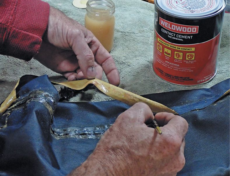 Weldwood Contact Cement develops a reliable bond with 3-ply laminates that use cloth-backed tape. We’ve used it for a variety of projects over the years. It dries relatively quickly, becoming tacky in about 25 minutes and fully cures in seven days. In our experience, Weldwood is a reliable glue for tape seams, but it eventually dries out after 10-20 years, depending on usage.
