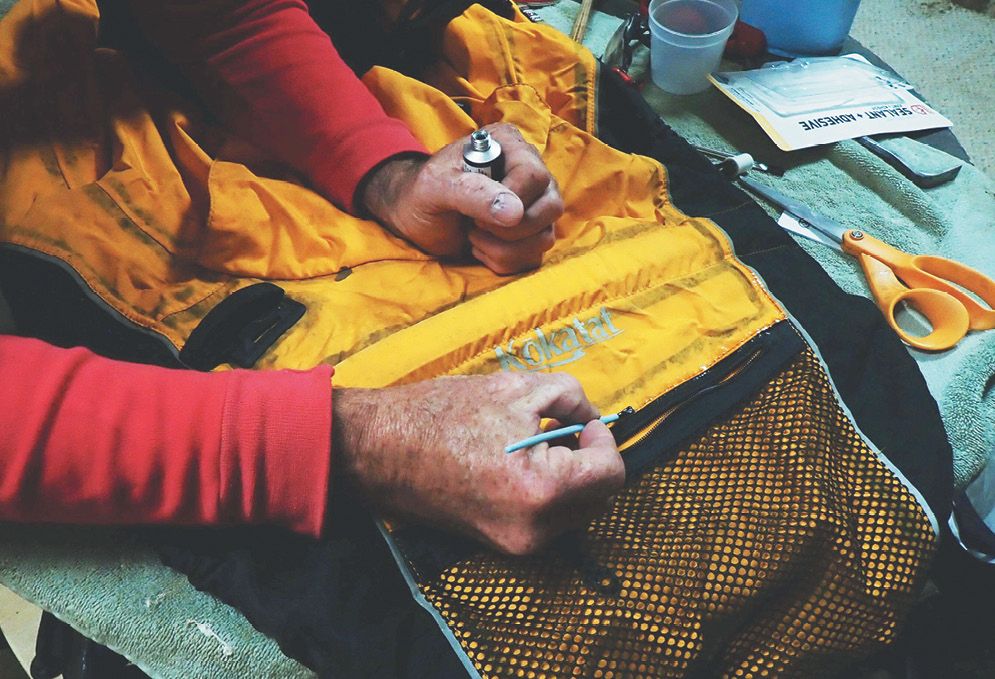 For repairing tears and holes, we’ve been using patches of Sunbrella or other material glued on the inside with Sika 291, Loctite PL S40, or Seam Grip. These repairs are a little messy, and they take overnight to cure, but they will probably outlast the clothing. Gear Aid, the makers of Seam Grip WP, also make Aqua Seal Neo, a great contact cement for wet suit repair. They also make Aqua Seal SR, a shoe repair adhesive like Shoe Goo.