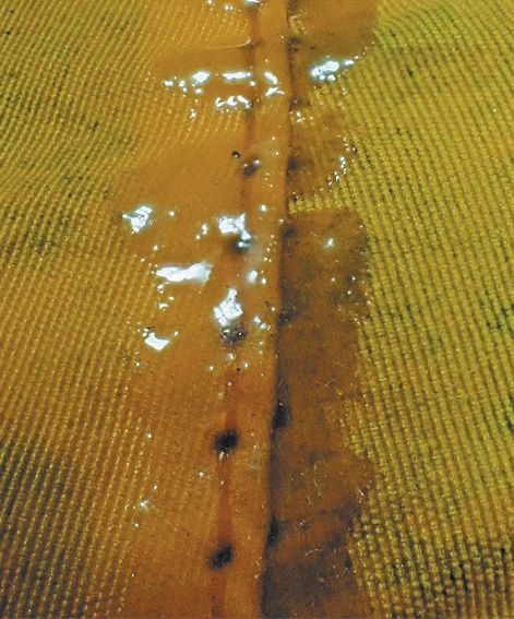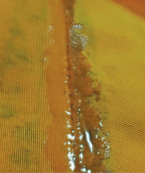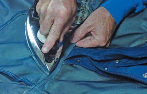 To ensure a good bond, carefully brush clean the seam and the tape—being careful not to damage the stitching. Coat both the seam area and the old tape generously with glue. Allow to dry for the recommended period (about 15–25 minutes for Weldwood), or until dry to touch but still tacky. If you wait too long, the glue won’t grab. If you apply the tape too early, you’ll have to keep pressing it down. Rub the edges of the seams down hard with a seam rubber or roller. Give special attention to any overlaps. A small tube (approximately 1-ounce) of either glue should be enough to seal one garment.