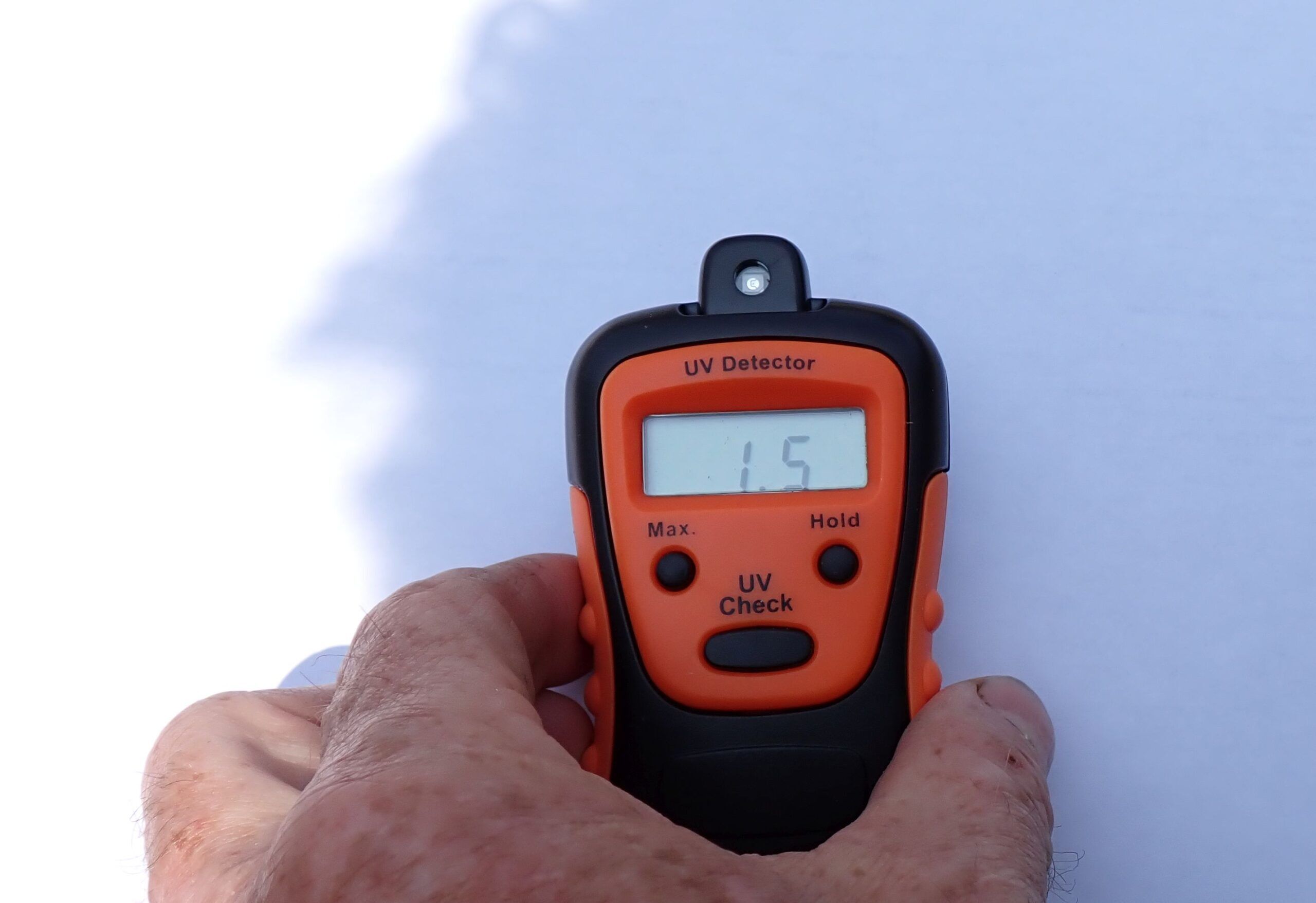 Testing. We calibrated our UV meter using layers of perforated metal screens of known free area (40%) to confirm linearity. Measurements were taken on at least four occasions, on days with UV index from 6 to 9.