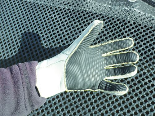 To this they added a layer of high-grip textured polyurethane on the palm and fingers, something like the face of a ping-pong paddle, only better. It is glued and edge-sewn with Kevlar thread to the palms and fingers, providing considerable durability. The idea was to duplicate the warmth of dive gloves with a hard-wearing palm and fingers.
