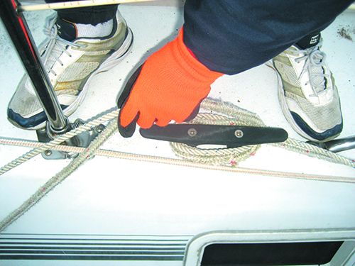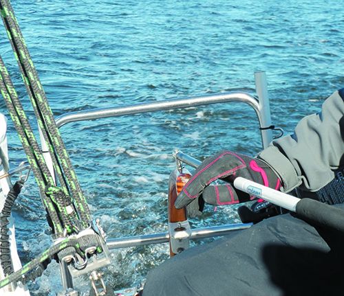 Practically speaking, coated gloves are pretty much the only gloves that absolutely will not leak… until you get water in the cuff. Some people like them at the helm, and for long turns in rainy weather because they won’t leak. They are also handy for handling wet dock lines and anchor rode, if you want to save wear and tear on your fancy gloves. Coated gloves wear rapidly if ropes are allowed to slide under high load; you’re better off with thick leather when actively trimming sheets.