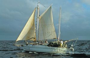 Built in 1937, our 12-ton double-ender did not fly. It was very old and very slow—slow enough for a curious humpback whale to loll alongside and gaze up at us for hours. Our path brought us into contact with people in remote parts of Indonesia, Papua New Guinea, and Borneo, who had little notion of how techology soon would touch their lives.