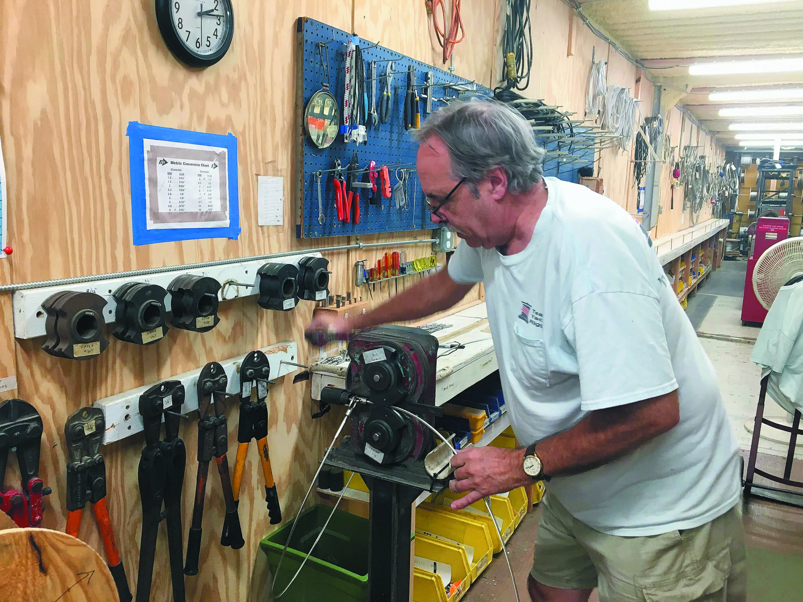 Rigger Glenn Mooney of Yacht Riggers in St. Petersburg, Florida has no choice but to be organized. A veteran rigger with more than three decades of experience, Mooney works out of two shipping containers joined end-to-end at Salt Creek Marina. The setup suits him just fine. The walls are neatly arranged with the hardware, tools, and accessories that his job requires, and two long workbenches line either side.