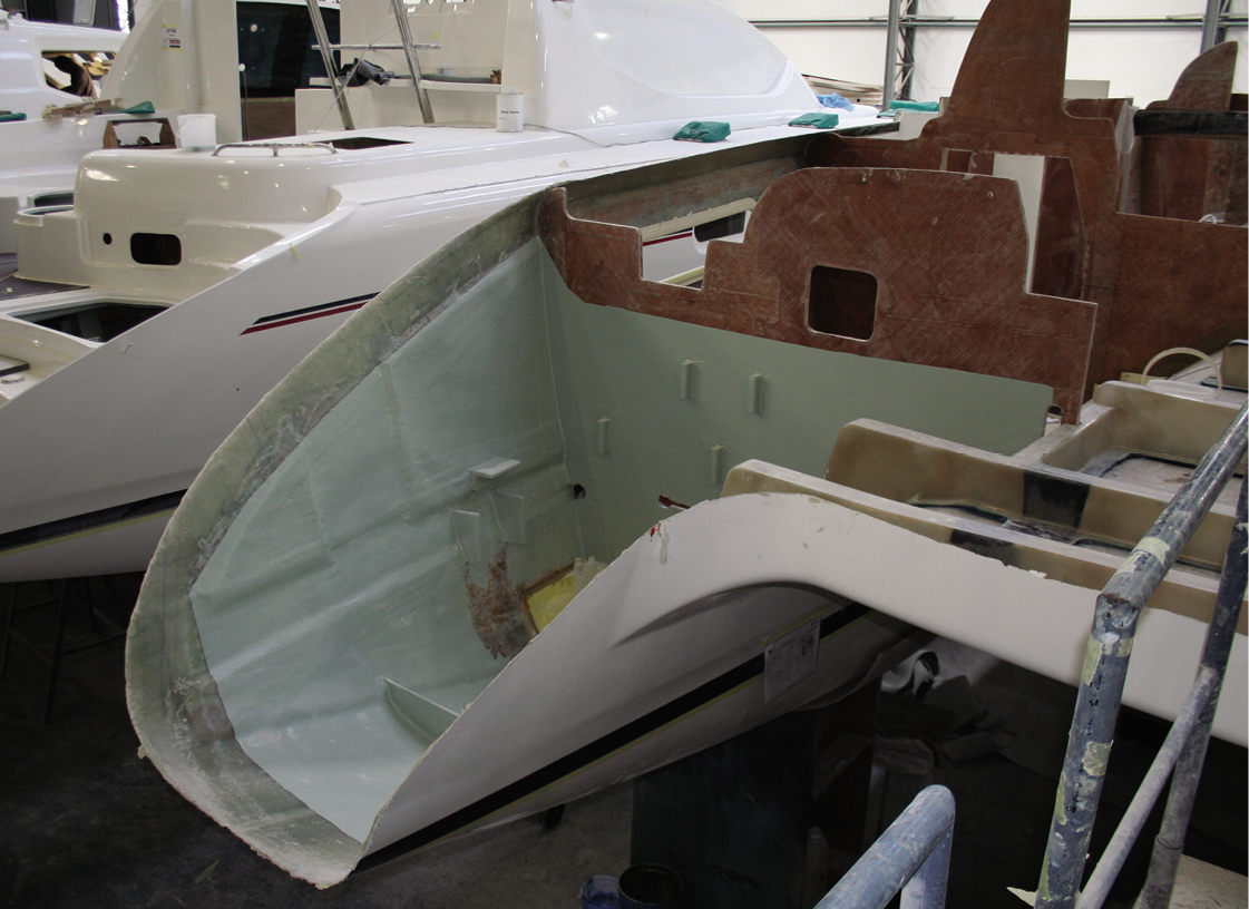 In a stick-built boat, a shipwright builds piece-by-piece the interior furnishing—lockers, berths, settees, etc. The interior structures on contemporary boats, by comparison, are often pre-molded into one or more large “pans,” fiberglass liners, usually finished with gelcoat on the facing surface, that are bonded into place.