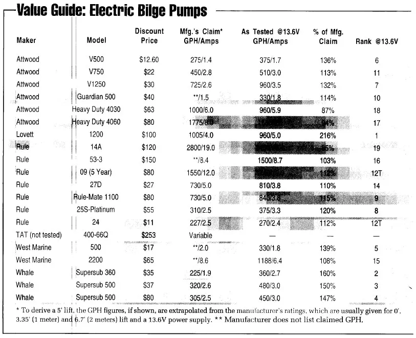 The three Whale pumps tested sixth, seventh and ninth, the latter two in ties with the above-named Rule pumps. Although mediocre performers in the volume-per-amp category, they are distinguished for pumping very close to what the Irish company claims. In addition, these new pumps are compact, easy to install and appear to be made in the Whale tradition. They’re a mite pricey.
