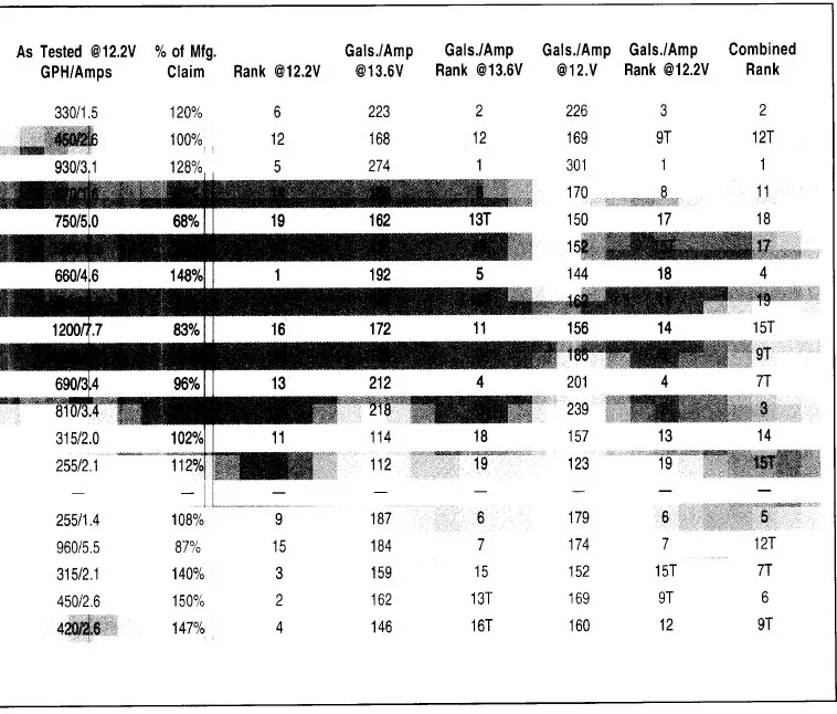 Lovett’s Model 1200, a very solid, well-executed design, performed very well (see photo on page 22), but only when supplied with 13.6V. When operated with 12.2V, it slipped down in the gallons-per-amp rankings, but still pumped more than its rating.
