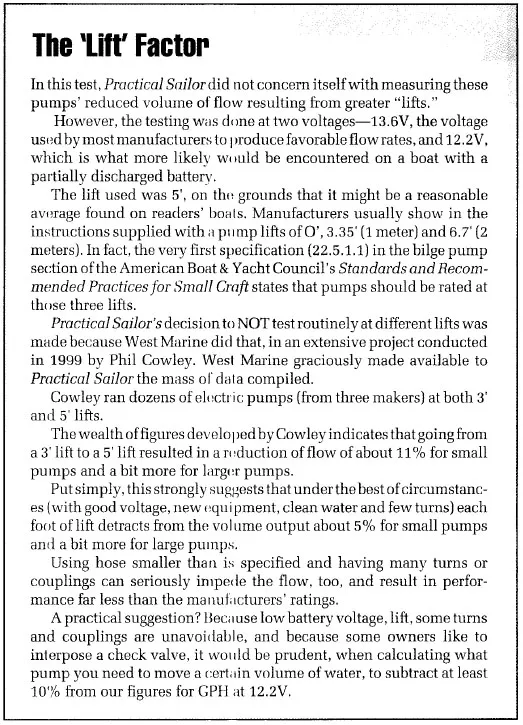 As was discussed in the report on manual bilge pumps in the April 15, 2000 issue, the question of “lift” is important. Manufacturers rate their pumps for zero lift. It’s called “open flow” or “open bucket.” It just means the water intake, discharge and pump are in a horizontal line. They often include the “open flow” rating in the pump’s name.