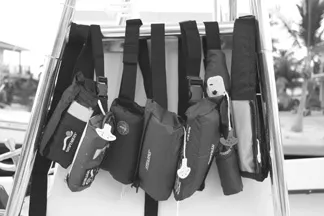 Four makers provided us with products. Mustang supplied a single unit, the MD3025, Seapro sent its SSB25 belt, and Sospenders loaned us its 38MBP. All three are manually deployed. Stearns sent three units for testing: two manuals, the 340 and 375, as well as an auto/manual belt, the 575. A single belt from West Marine rounded out the field—West’s Manual Inflatable Belt Pack, model no. 3742103. (It is the same as the Sospenders 16MBP, and is manufactured by Sospenders.)