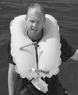 Stearns’ 340 model is the only belt we tested that did not inflate into a full vest. This unit’s bladder inflates into a large tube that rests on the wearer’s belly. A strap goes around the back of the neck to help hold the bladder in place and allow the user to reach the oral inflation tube. Like the smaller Sospenders unit, this belt carries Coast Guard certification only for inland waters. Testers found they had to remain vertical in the water to maximize the buoyancy of the Stearns 340 and even then they found it lacking.