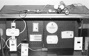 The detectors were placed in the test tank filled with regular atmospheric air. After prescribed warm-up periods, CO was metered into the sealed tank until required levels were reported on the calibrated precision detector. A timer was used to determine the response time of the detectors that were tested. Upon alarm of the last detector, the test was stopped. The volume of the tank was replaced with clean air and the time-to-silence was checked. All systems were depowered and allowed to sit in fresh air for 24 hours prior to testing at the next level.