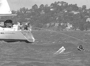 The 2005 Crew Overboard Recovery Trials were sponsored by West Marine and Modern Sailing Academy, a Sausalito sailing school and charter outfit that provided several boats. Previous rescue trials put on by West Marine’s Chuck Hawley and MSA’s John Connolly produced several valuable discoveries. In 1996—the last trials before this year’s—we learned about the elevator method for recovering victims without special gear, and about which lights work best for effecting rescues at night (the answer is to use strobes at a distance and incandescent lights up close so rescuers and victims aren’t blinded). I participated in the 1996 event and incorporated its lessons into the 1999 edition of The Annapolis Book of Seamanship.