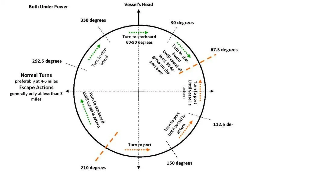 How to handle large ships. Normal turns can be performed at a distance of six  miles or more. Outside this distance, we are clear to maneuver as we like to avoid collisions. But once within the normal turning distance of the larger, less maneuverable vessel, we are bound by Section 2. Once we are within the “in extremis or emergency distance for the less maneuverable vessel,” possibly as much as 2 miles for a large ship, we are bound by Rule 17. Suddenly, being a sailboat does not automatically make our vessel the stand-on boat. It’s a simple situation to avoidif ships follow steady course. But often, they must turn to follow a channel, enter a side channel, or even line up with range markers to  maintain bottom clearance. They might be avoiding another large ship you even considering.  Monitoring 16 helps; they may have contacted you and you missed it. Whether sail or power, you must avoid as per Lott’s polar diagram, because that is what the ship’s crew expects. Some will call this the rule of tonnage; it does not exist. What does exist is a very real difference in the distance when rule 17 applies.