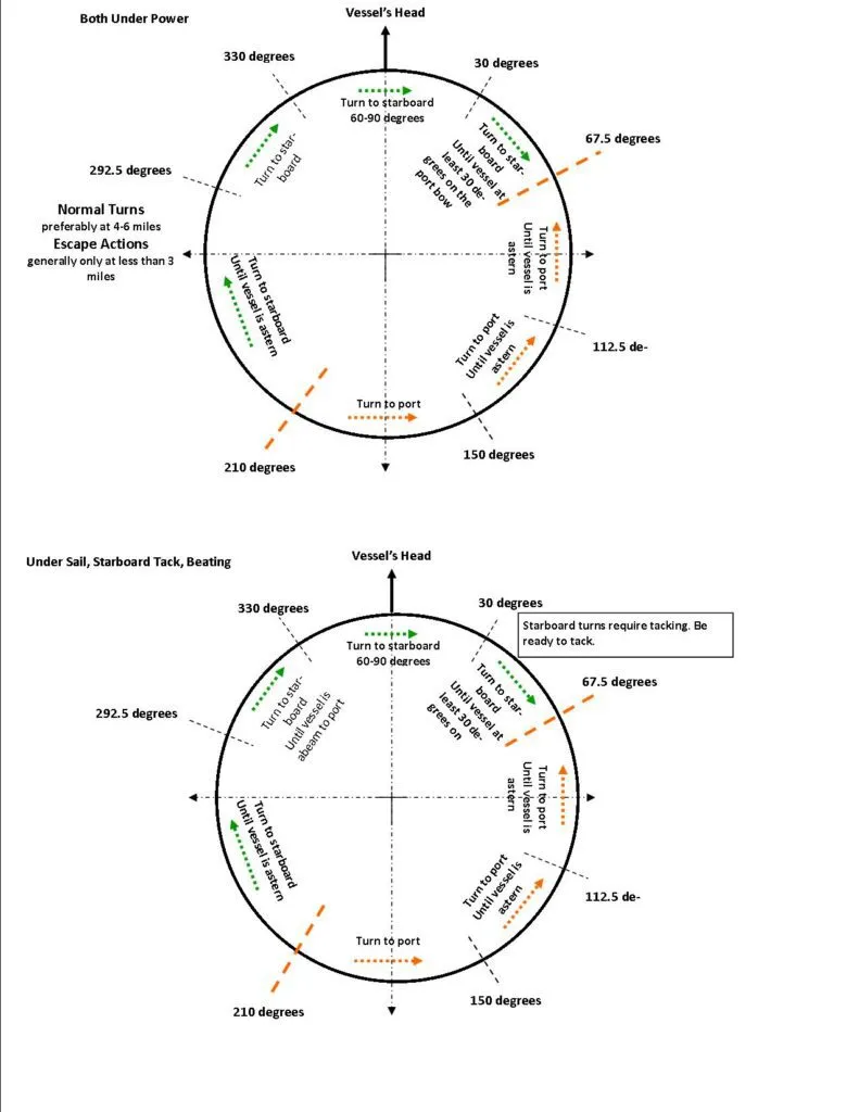 The recommended turns are mostly the same, though in some cases the risk of an unplanned tack or jibe leaving the boat unmanuverable may change our decision points by a few degrees. But don’t be afraid to let the sheets fly and make turns you aren’t ready for; the boat will likely carry enough way to get you out of a tight spot and the damage and injury will be less than getting T-boned.