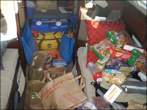 All told, we had 11 linear feet of bookshelf space on Tosca. Most of those were novels, non-fiction travel books, and a couple of indispensable classics-“The Odyssey,” “Don Quixote,” and “Moby Dick” among them. Nav books went in a six-square foot locker under the nav station seat. A plastic bag full of paperbacks sat at the bottom for the hanging locker.