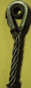 2. This 7″ x 19″ emergency headstay ends in a spliced eye around a pressed stainless steel thimble, reinforced with a hand-made bushing. The bushing was cut from an old Tobin bronze prop shaft and drilled to fit the clevis pin. Regardless of whether it’s a wire rope or HMPE cordage, it’s important to prevent tension-induced thimble elongation and flattening.