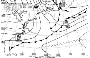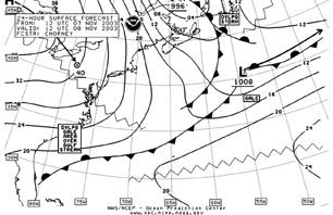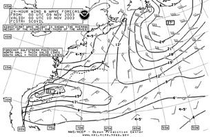 Real Weather Ltd. We bought the “Delivery Package” from Real Weather. It consists of three consecutive forecasts, starting two days before the scheduled departure date. Like the product from Commanders’, the forecast from Real Weather was organized into a text discussion of the overall weather scenario, a table of wind speeds and directions at six-hour intervals, and weather charts covering six days. We received our first two forecasts from Real Weather on 11/6/03 and 11/7/03, based on the assumption of a departure on 11/8/03. The forecast text and charts were delivered via e-mail.