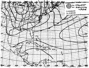 Commanders’ Weather Corp. We bought a single cruising forecast from Commanders’ Weather, which was delivered by e-mail the day before departure. The forecast was organized into three parts: a discussion of the overall weather scenario and what to expect along the delivery route; a table of predicted wind directions and speeds at six-hour intervals; and weather charts for the following six days, plus a chart of the Gulf Stream position.