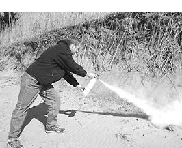 Another factor that struck us is the dramatic loss of visibility that occurs when you use one of these extinguishers. Our fire became completely obscured by the thick cloud of dust from the extinguishers, and aiming became more a factor of memory than of visibility. The third aspect of using one of these dry-chemical extinguishers is the thick covering of white powder left behind after the fire is out.