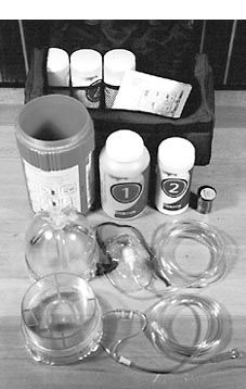 One can each of the two chemicals, mixed with the water, begin immediately to produce oxygen, which bubbles up into a clear plastic dome on the top of the tank, then into a tube, and from there into either a cannula (the gizmo that drapes over your ears, with little tube stubs that fit loosely into your nostrils), or a mask.