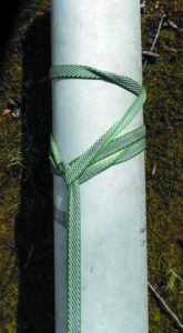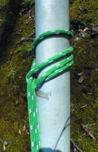 We’ve used many materials over the years and none have failed to grip. Our favorite has become 3/8-inch polyester double braid, primarily because it is easier to handle with gloves on and we like to wear gloves while climbing, for increased grip and so that we can hold on to wire stays when needed. That said, webbing slings and larger diameter rope of sufficient strength works fine. Do not use hollow braid Dyneema, such as Amsteel. It is slippery on the mast and the knot can jam.