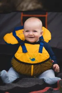 Finding the right life jacket for your child is the first step. Look for a jacket that matches your child’s age and weight and includes features like a “heads up” cushion for infants and grab handles at the back for toddlers. Ensure the vest comes with a crotch strap so your little one can’t slip out of it, and an attached whistle (we’ll cover that feature in more detail later).