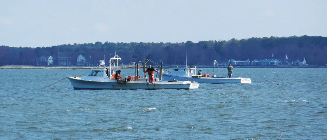 This oyster boat is anchored and fishing with hand tongs. There is no specific day shape for this type of fishing; it is generally treated like an anchored vessel.