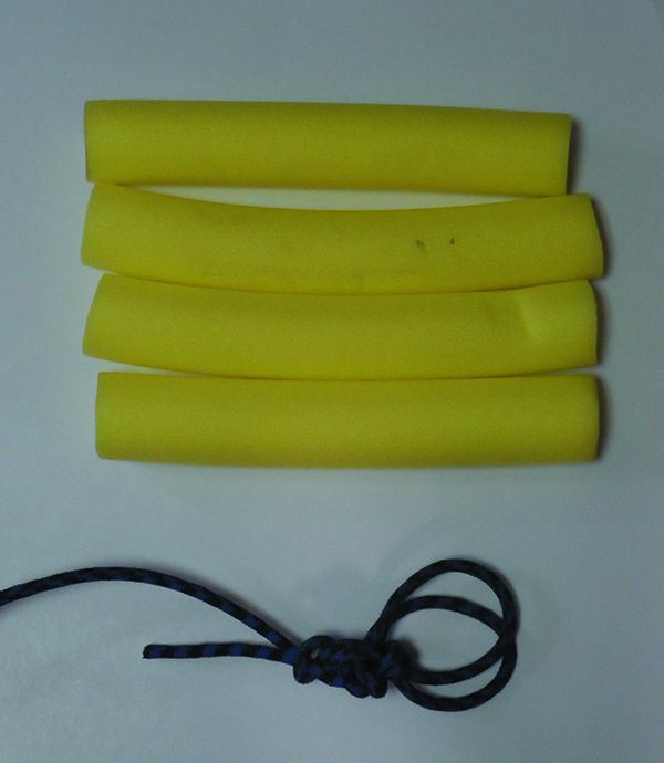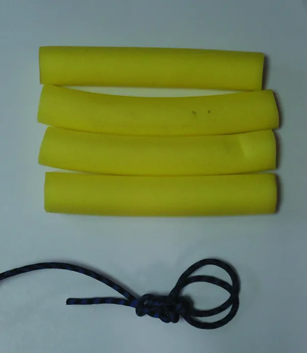 - Thread the line through one of the noodle pieces, and tie an overhand loop tightly against the piece. The loop should be about 6 inches long; enough to easily insert a gloved hand.