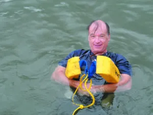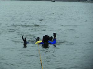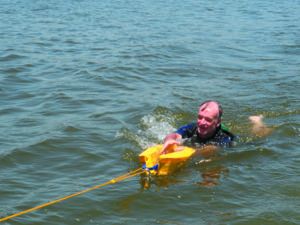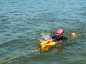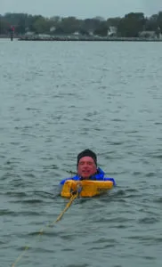 Whichever device you use, we recommend practicing with the Lifesling in both calm and breezy conditions. Getting into the sling is more difficult if the boat is moving relative to the swimmer or there are waves. Practice with the boat moving slowly, so that you can see it is not a simple matter of pulling it over your head. You are more likely holding on with one elbow looped through it, and then rolling into it.