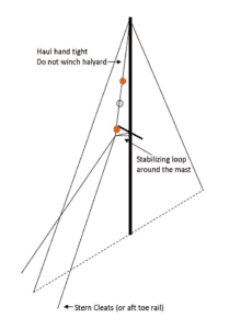 14. Rig using non-stretch line (a halyard is good for the top) to reduce swinging. In wild weather, reduce swing by rigging the bottom line as a bridle that secures to the port and starboard toe rails (see Image 4). To prevent fore-aft swinging, add a loop (about 30 inches long) attached to the bottom light and around the mast, and raised to a point just below the spreaders. The bridles should be led aft and outboard. The lights must be pulled several feet away from the mast to keep the blind spot less than 6 degrees. The lights will hang at a slight angle, but this is not a big deal. In our case, the mast is raked sufficiently to serve this purpose. There is no need to pull the lights to the masthead, although they should be high enough to be visible above the swell.
