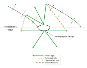 However, the USCG COLREGS manual clearly shows the green light some distance down the mast, where it will be blocked in some directions by the mast and sails. Green light will also reflect off the sails, which can be annoying. Commonly, instead of a single green light, 180-degree green side lights are mounted on each side of the mast, 1-meter down, with a red light at the masthead.