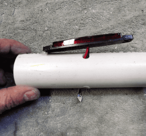 2. Drill three x 5/16-inch holes in the side for the light’s wires (Photo 1). Fit should not be too tight—you don’t want to pinch the wires. The holes are centered between the ends and spaced around the pipe 120 degrees apart. An easy way to mark for drilling is to wrap a sheet of paper around the pipe and cut at exactly one circumference length. Fold the paper into thirds, mark the folds, and wrap again. The folds will be 120 degrees apart and in line vertically, ready for marking