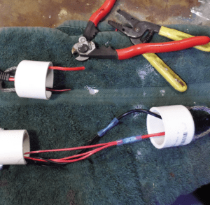 We mounted the lights around an 8-inch length of 1 ¼-inch PVC pipe; a single 5/16-inch hole passes the wires, two screws attach it in place, and it is sealed in place with a generous application of polyurethane caulk (we used Sika 291). The leads are coupled to a common 12V SAE 2-pin extension cord. Remember, LEDs are sensitive to polarity, so keep the positive and negative straight and used polarized plug connectors. The current draw is low enough (0.09 amps or 2.2 Ah per 24 hours) that we skipped the photo-electric cell that would turn it on and off automatically.