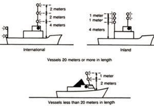 Vertical spacing of lights is covered in Annex I. For boats less than 20 meters in length, the vertical row of lights must be greater than 2 meters above the uppermost continuous deck, spaced one meter apart, and be visible in all directions (no more than 6 degrees may be blocked by mast). For boats greater than 20 meters, the lights must be 4 meters above the deck and the spacing must be 2 meters (see illustration 2, page 18).