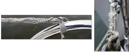 Those who are already familiar with using cordage strops and lashings to attach hardware will feel more comfortable with a fiber lifeline installation. Obviously, strength and reliability are key concerns when installing a rope alternative to wire. Abrasion will become more of a concern, and each hard spot or contact point along the run of the line needs some consideration.