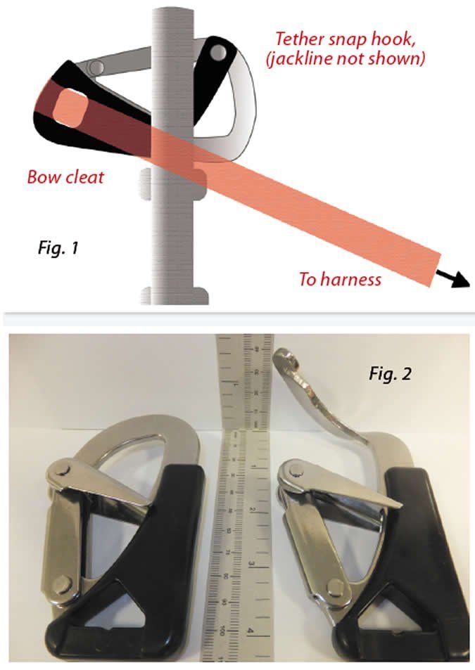 Simon Speirs was using a three-point webbing tether attached to the integral harness of his lifejacket that allowed him to clip on to the yacht with a short or long tether. A safety issue identified during the investigation was that the hook on the end of Mr. Speirss tether had become caught under a deck cleat (see Figure 1), resulting in a lateral loading that was sufficient to cause the hook to distort (see Figure 2) and eventually release.