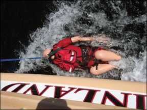 For an idea of the forces at work, see the photo with the MOB letter of Rescue Randy, a dummy used in Coast Guard MOB drills, being dragged alongside a boat. The picture gives you an idea of the difficulty crew will have in getting back on board without help, particularly on a boat with high freeboard. One thing to note is that if the MOB is wearing an activated inflatable PFD, they will have a harder time scrambling back on board. Crew should know how to deflate the vest quickly or have a knife handy.