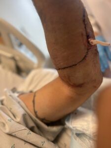Steadfast and always encouraging, Elizabeth stayed at my side until they took me back to surgery. Riding in the elevator to the operating theater—under the influence of pain meds—I was relieved to learn that the worst case scenario only involved the loss of my hand. I asked Elizabeth, “If they take my hand, Will you please tell them to give me a hook as a prosthetic?”