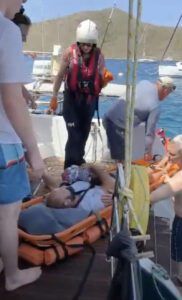 Supplement your boat’s first-aid kit with any items that will help stop bleeding. Stopping bleeding is rule one. In my case, it would have been helpful to have a roll of Saran Wrap or Cling Wrap ready to go. The tourniquet helped, but I was glad my guest the gastroenterologist knew to loosen that every eight minutes to restore blood. He probably saved my hand. Brief your guests on the action plan if someone gets badly hurt on board. Stopping blood. Restoring respiration. Stopping shock. All these things are critical. If you’re the client, ask your charter company if the crew of your boat has had first-aid or CPR training. The answer will be an emphatic yes if your captain is licensed. If you’re sailing with older people —your parents for example—you’ll want to know if there is an automatic external defribrilator (AED) on board. And maybe oxygen. Your pre-departure checklist should include the basics on where PFDs, signal devices, and fire extinguishers are located. Always, always… adults need to pay attention to keeping kids safe, not reaching for another Pussers. (Are they wearing their PFDs?) But brief your passengers on how to use the radio, or a cell/sat phone. Assess the capabilities of passengers. Can they start the engine, get the anchor up, and start motoring for help if the captain is not availble? Captains and crew in various charter operations need to communicate regularly about the local action plan if a person needs to be rescued and transported. Lending a helping hand to a fellow mariner is an inviolate part of our culture. Where would I have been without Kevin and Elizabeth? Their, timing, skill, and reassurance changed everything and probably saved my arm, my sailing career, perhaps my life. Talk to each other, and have each others’ back. Leave your ideas…or tell us your story… in the comments.