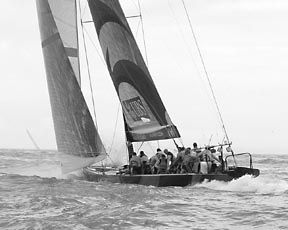 With the boat heeling excessively in the strong winds, water poured over the side decks, flooding the leeward side of the cockpit.