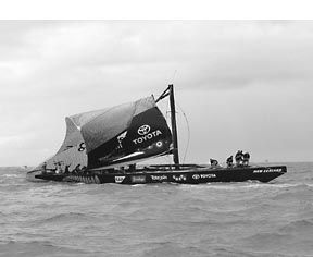 Loads on every part of the boat increased dramatically with tons of water on board. The end of the innovative TNZ lightweight girder main boom snapped off, making it impossible to flatten the mainsail. The over-full mainsail simply caused the boat to heel even more.