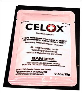Sam Medical Products also markets Celox, a hemostatic agent used to control severe bleeding fast. Each 4-inches-square packet contains hemostatic granules that, when applied to the source of bleeding, form a “robust” gel clot in less than a minute. The product works independent of the bodys normal clotting process, and even works in the presence of extreme cold. In an emergency when an artery has been severed, a hemostatic agent, combined with compression and bandaging may mean the difference between life or death. Available through medical equipment suppliers, a packet of Celox sells for $14 at www.rescue-essentials.com.