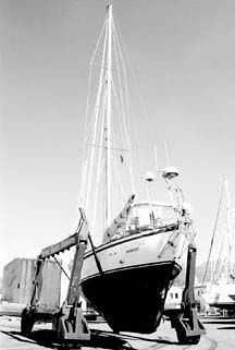 This time, we thought we were to be hauled on theyards 100-ton lift. Instead, they directed us to the ramp where hauling is done on a custom hydraulic trailer. This trailer is rated, I later discovered, for 12 metric tons-about 26,500 pounds. Fully loaded and stocked, we go about34,000 pounds, and even without full fuel, full watertanks, and with a reduced store of provisions, weweighed at least 33,000 pounds at this point, judgingby our flotation.
