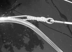 Be sure to match the number of turns of line to the strength of the wire. Eight turns of 1/8″ Spectra braid has a raw breaking strength of about 4,800 pounds, but this strength is reduced by bending the line tightly around the terminal eyes on the lifelines and pulpits. A couple of extra turns of line will provide adequate margin. Finish it off with a series of half-hitches, and bury the tail.