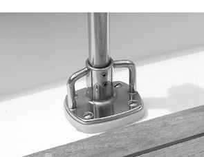Whether cast or welded, stanchions bases should have strong bracing bails. These bails can be used as fixed safety harness tether attachment points, as well as lashing points. We would not recommend attaching highly-loaded deck gear such as snatch blocks to stanchion bases unless they are extremely rugged or the loads are light.