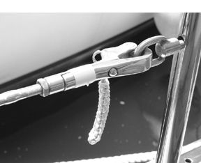 On lifelines equipped with any form of pelican hook on the gates, always tape the hook closed when sailing to prevent accidental opening. This should be part of your routine before any passage: examine lifelines for wear or corrosion, tighten stanchions in their bases, and tape gate fittings closed.